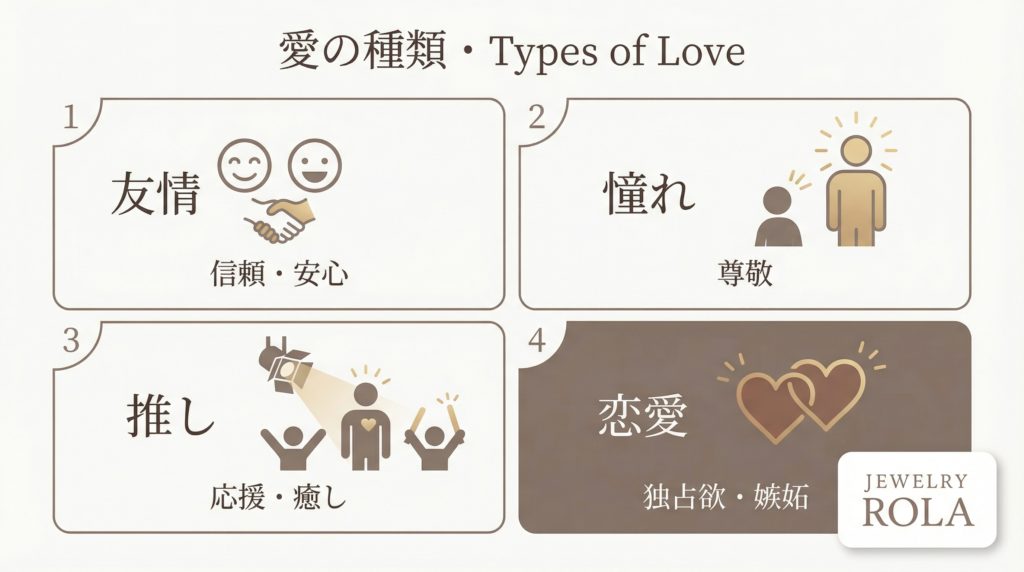 女性が口にする「好き」を大きく分類すると、4つの種類に分けられます。それぞれの特徴を理解することで、相手の本心が見えてきます。