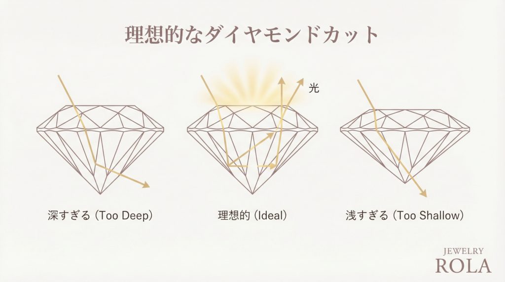 カットが浅すぎたり深すぎたりすると、光が石の底から逃げてしまい、輝きが失われます。理想的な角度と比率でカットされた宝石だけが、最大限の輝きを放ちます。
