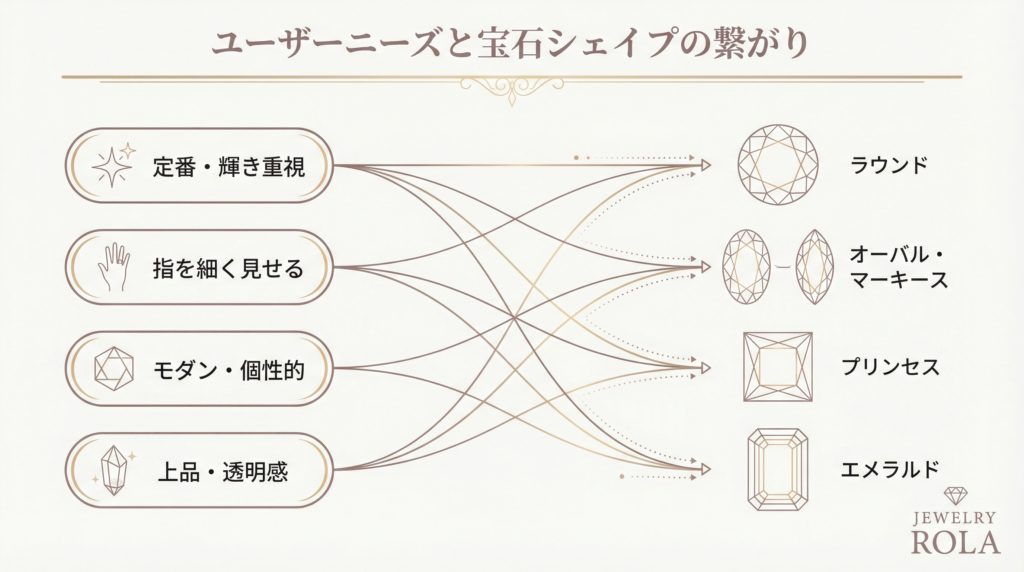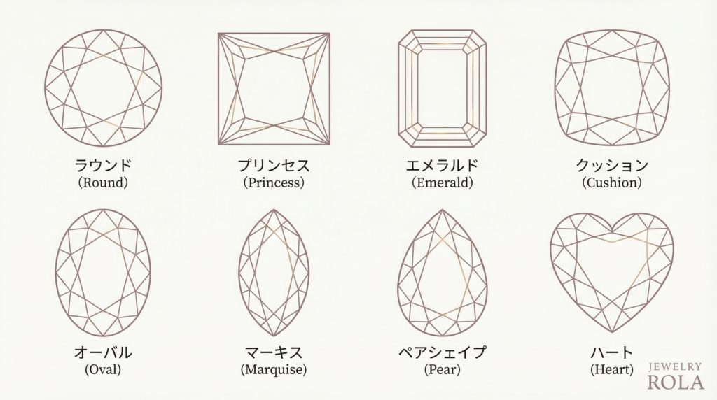 ラウンドブリリアントカットの圧倒的な輝き、プリンセスカットのモダンな魅力、エメラルドカットの上品な透明感——それぞれに異なる魅力があります。