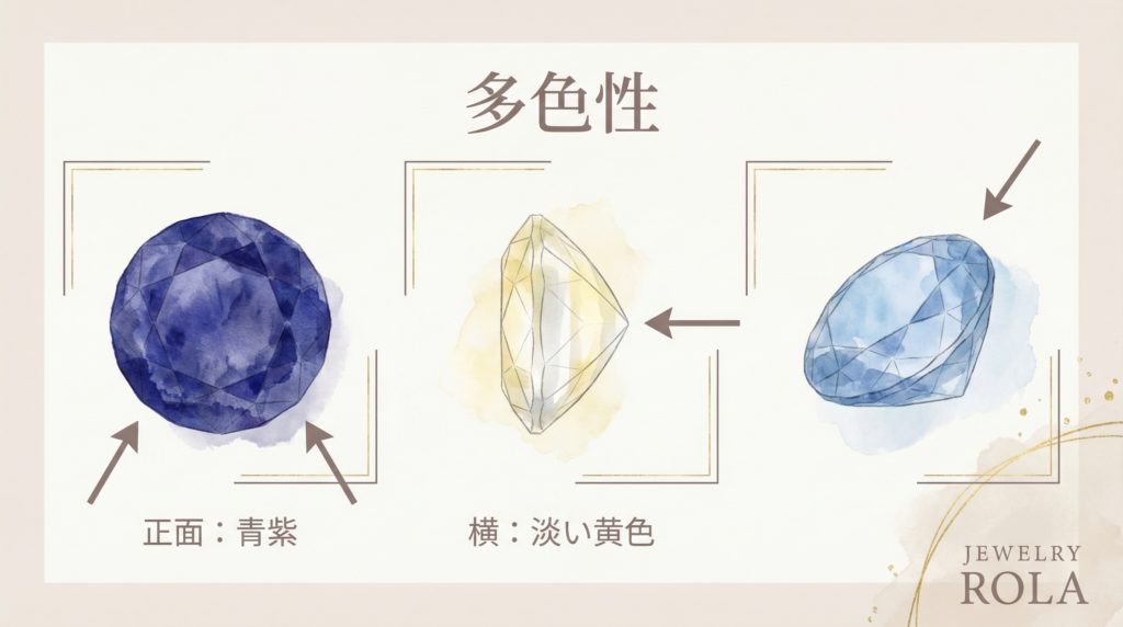 アイオライトの場合、結晶の方向(X軸・Y軸・Z軸)によって「青紫色〜紫」「淡い黄色〜淡い緑」「淡い青」の3つの色が見えます。これを「三斜晶系(さんしゃしょうけい)多色性」と呼びます。